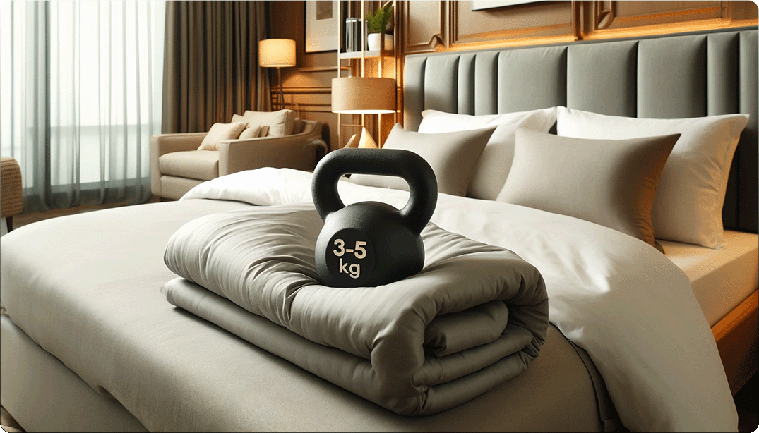 Det är viktigt att välja ett tyngdtäcke som är anpassat till din kropp. En bra riktlinje är att tyngdtäcket bör väga ungefär 10% av din kroppsvikt, även om vissa tillverkare rekommenderar upp till 15%. Om du köper ditt första tyngdtäcke rekommenderar vi att börja med ett som motsvarar cirka 10% av din kroppsvikt. Till exempel, för personer som väger mellan 25 och 40kg rekommenderar vi ett tyngdtäcke som väger 3kg.